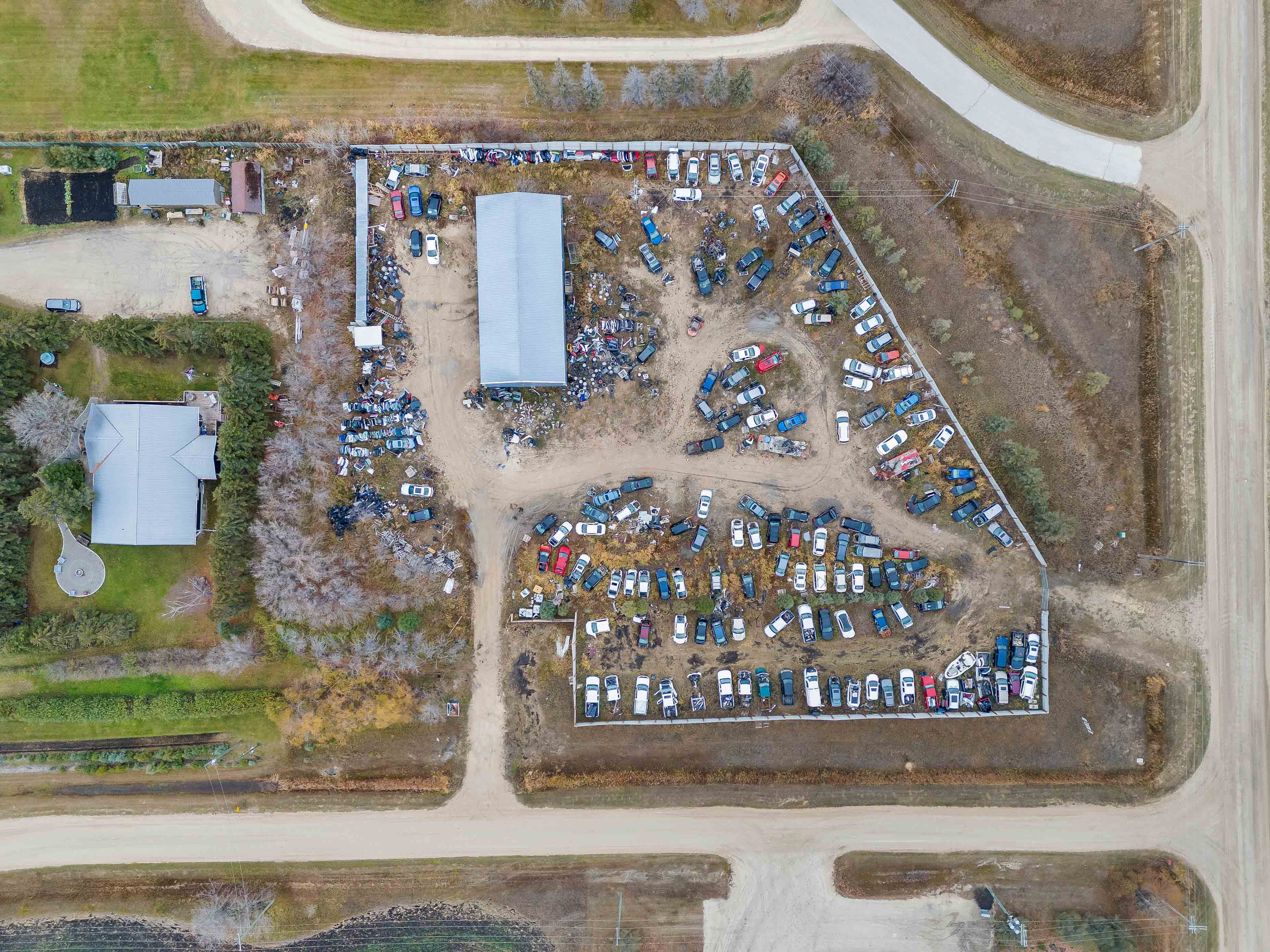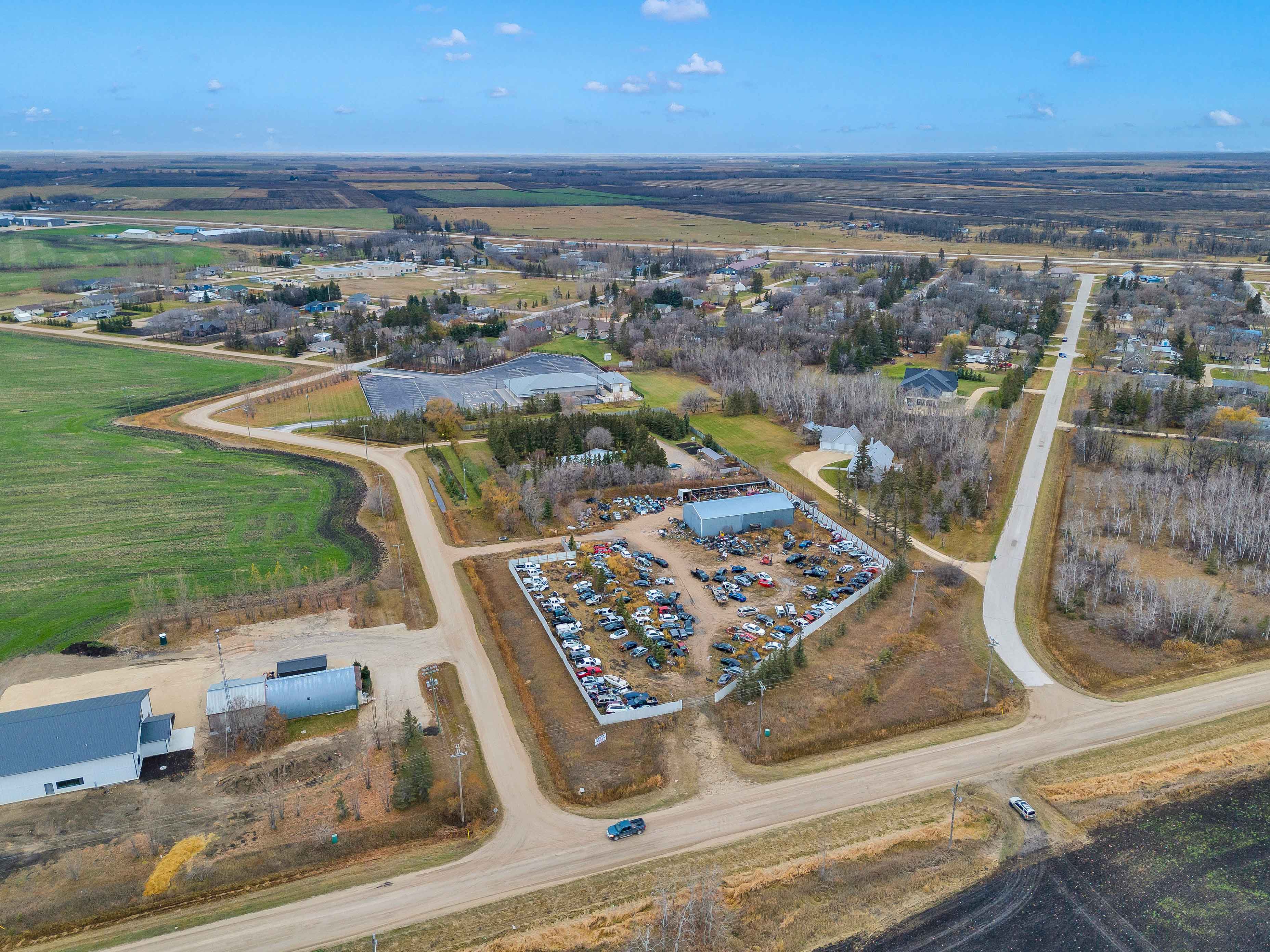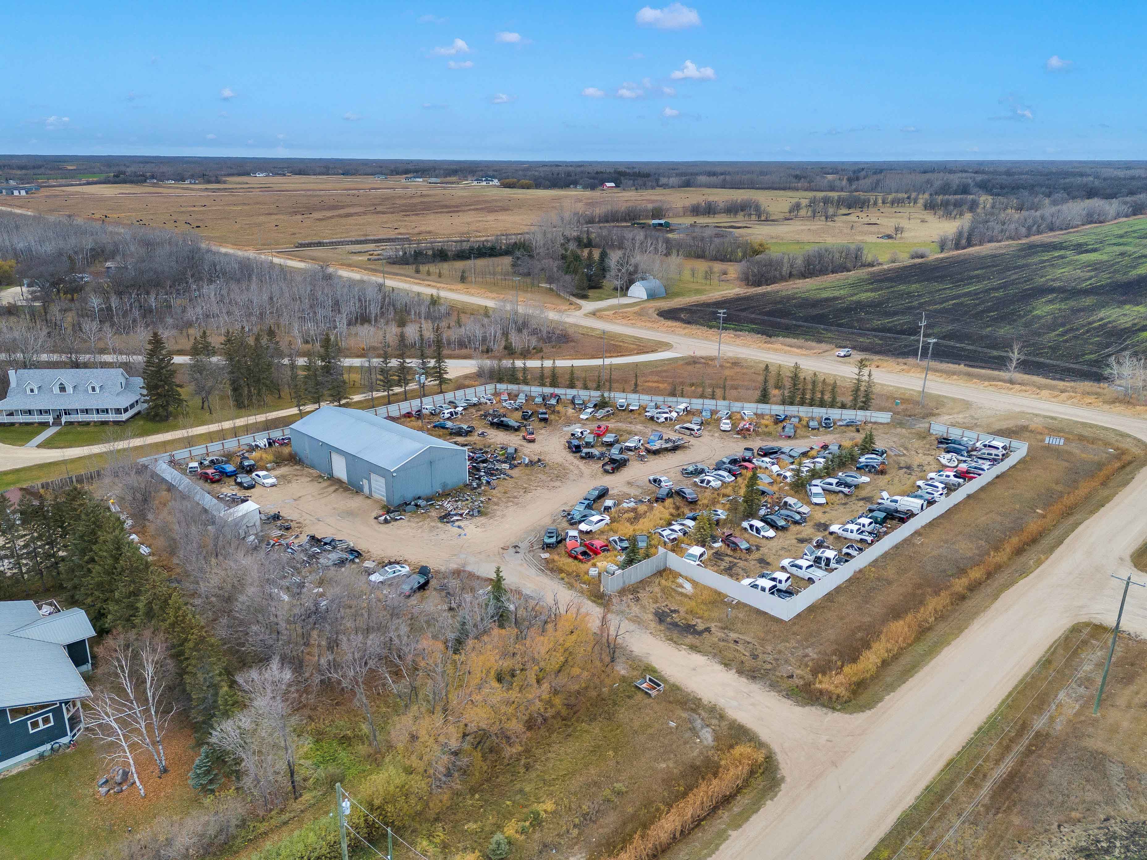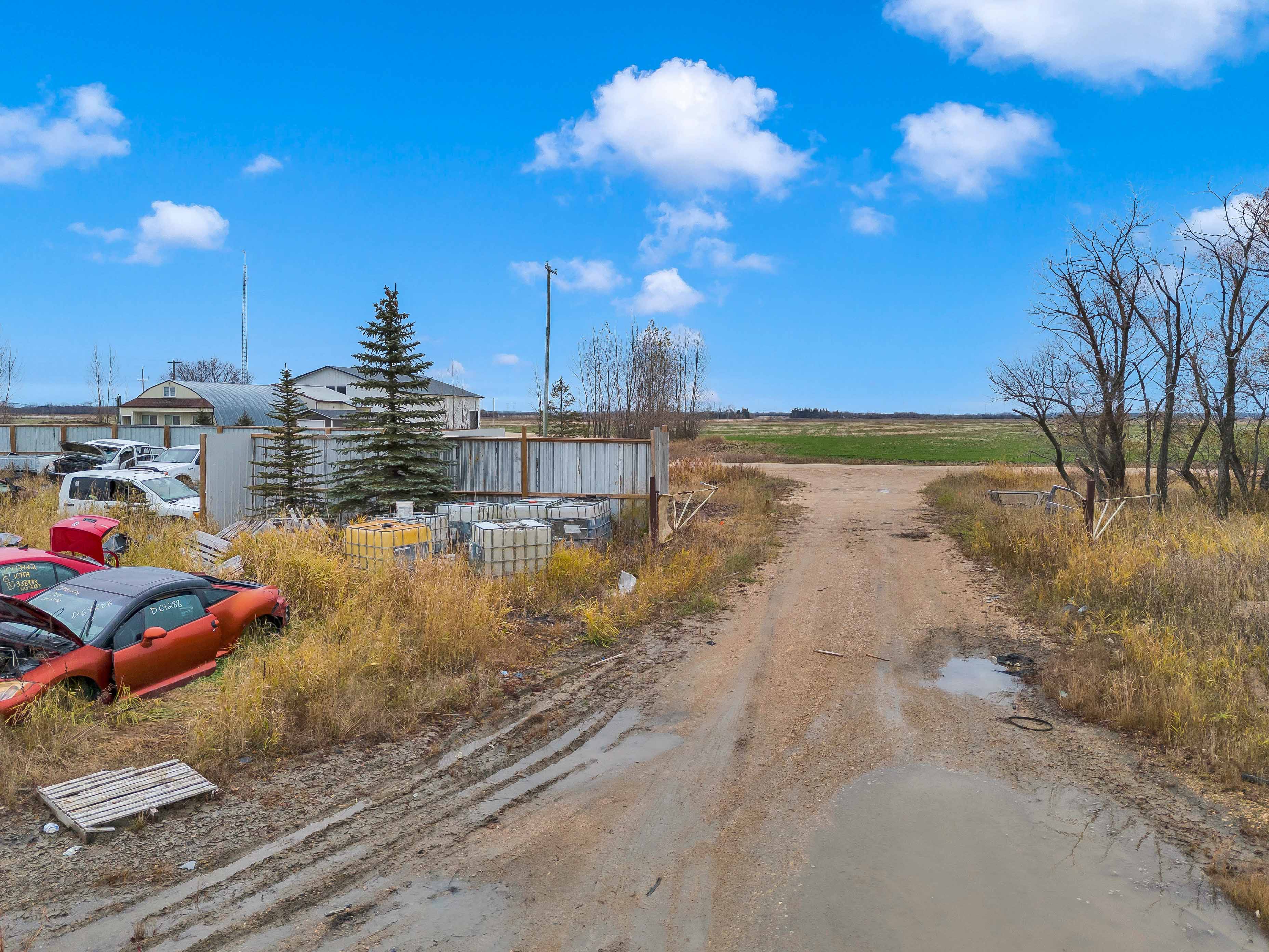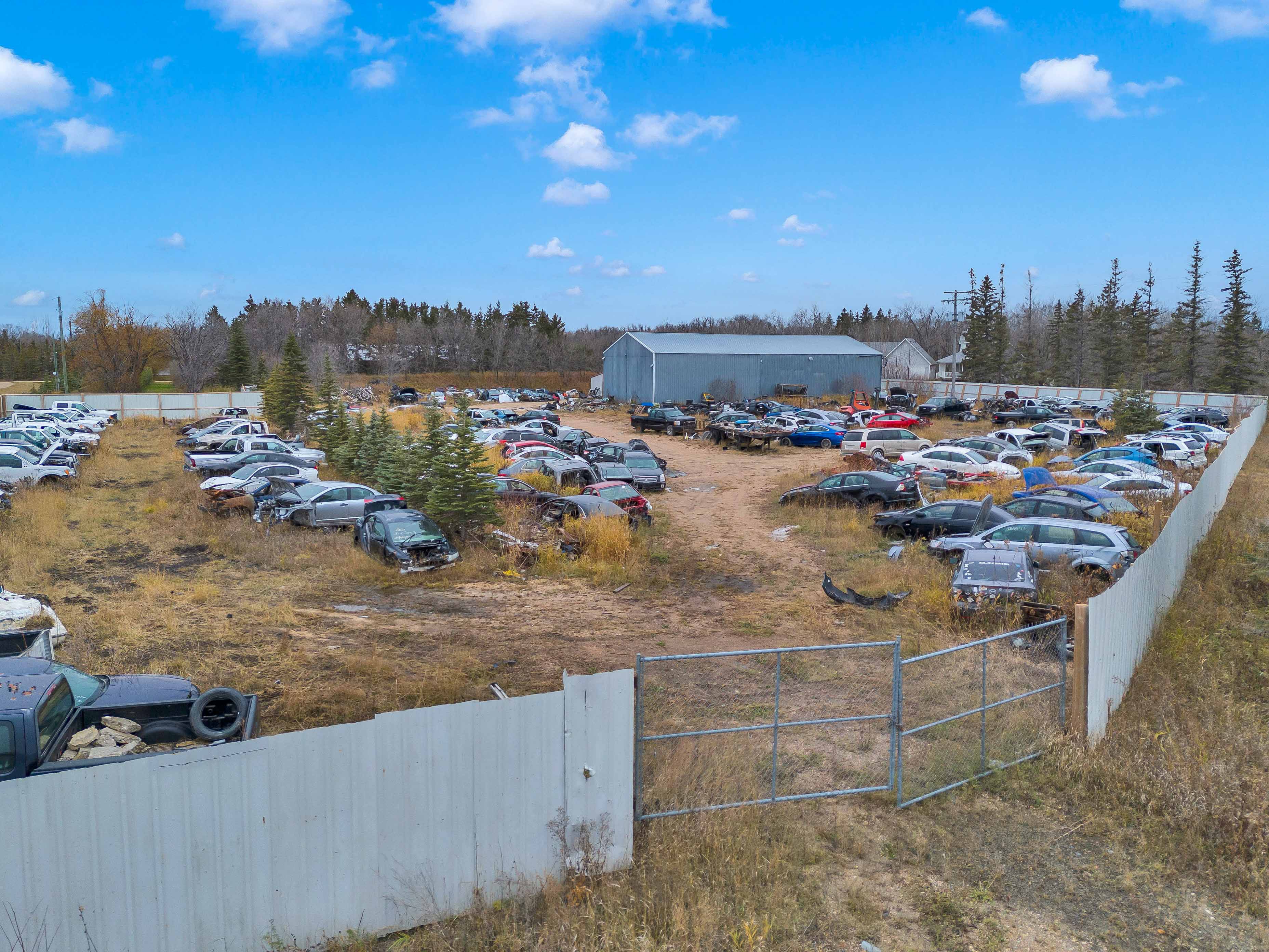 Exceptional Commercial Property Opportunity, just 20 minutes from the city! This property features a spacious 40x100 serviced building with 600v 3-phase power, gas heating, 3 hoists, and a 3-phase compressor—perfect for a wide range of businesses. The building also includes a second-floor office, bathroom, kitchen, and plenty of storage space. Set on 3 acres of industrial-zoned land with conditional use approval for a wrecking yard, this site offers great flexibility for your operations. The secure compound is fully equipped with security cameras and an alarm system for peace of mind. Please note: All vehicles and parts are not included.