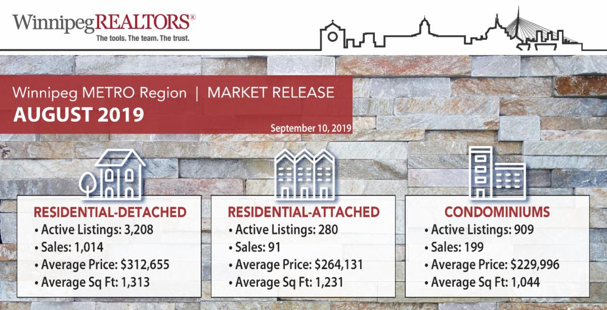 The real highlight of August 2019 was the 37% increase in condominium sales over August 2018. The 199 sales are 19% higher than the five-year average for this month and a few sales below the best condo month sales performances ever for the Winnipeg Metro Region.