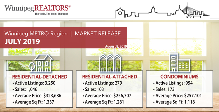 WINNIPEG –The Winnipeg Metro Region market heated up in terms of dollar volume with a new record set for July with $437 million representing a 10% increase over July 2018. Sales of 1,440 trended upward with nearly a 5% rise over last July and only 3% shy of the best July on record in 2014.